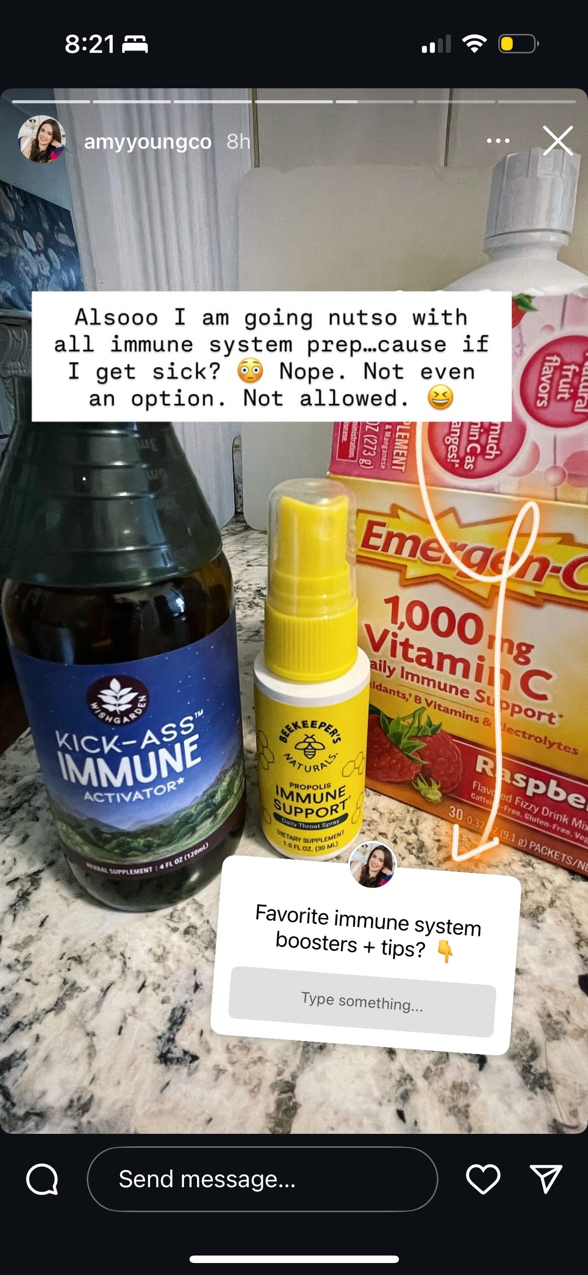 Immune boosters. Took this screenshot of my friend Amy’s story because we have been sick for nearly three months straight and are FINALLY HEALTHY over here. Before I saw her story I’ve been using the Beekeeper’s Naturals Propolis Immune Support for a couple of weeks and idk if it’s that or luck but even with travel and being around some sick kids it’s kept me healthy!