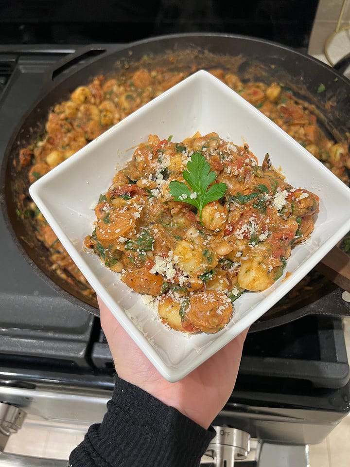 Yesterday night I tested out a new dinner recipe—white bean winter gnocchi. It was so fun to play in the kitchen and make a delish meal for my family. In my previous phase of life, there’s no way I would sacrifice a couple of hours of cooking when I could be doing “very important business things!” But wow. How soul-nourishing it is to get away from the screen and use your hands. To test the dish and savor the flavors. To hear your partner say, “Mmm, thank you for this, it’s so good.” And to see your baby banging her hands up and down in delight over what you made her.